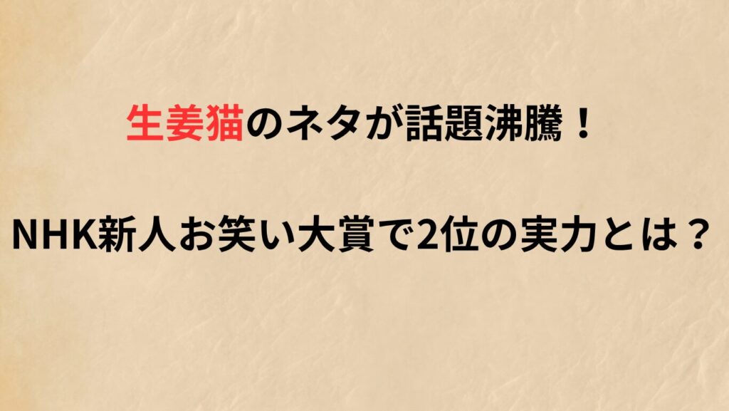 NHK新人お笑い大賞で話題を集めた「生姜猫」。彼らの漫才がどうしてここまで注目を集めたのか、気になりますよね。 ここでは、NHKで披露されたネタの詳細やSNSでの反響をもとに、生姜猫の注目度の高さの理由を探っていきます。 ㊗️NHK新人お笑い大賞準優勝... -