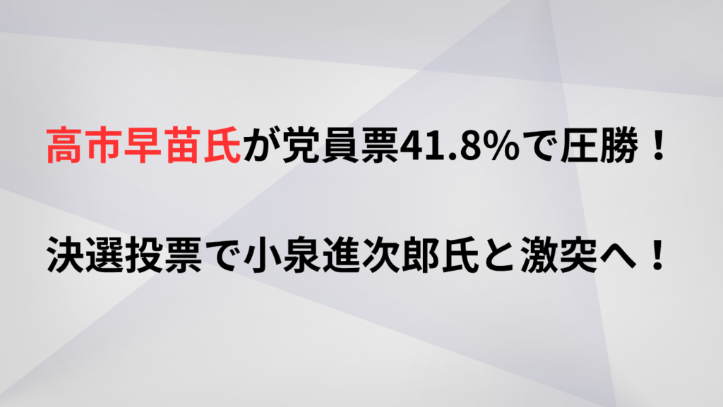 高市早苗氏が党員票41.8%で圧勝!決選投票で小泉進次郎氏と激突へ!